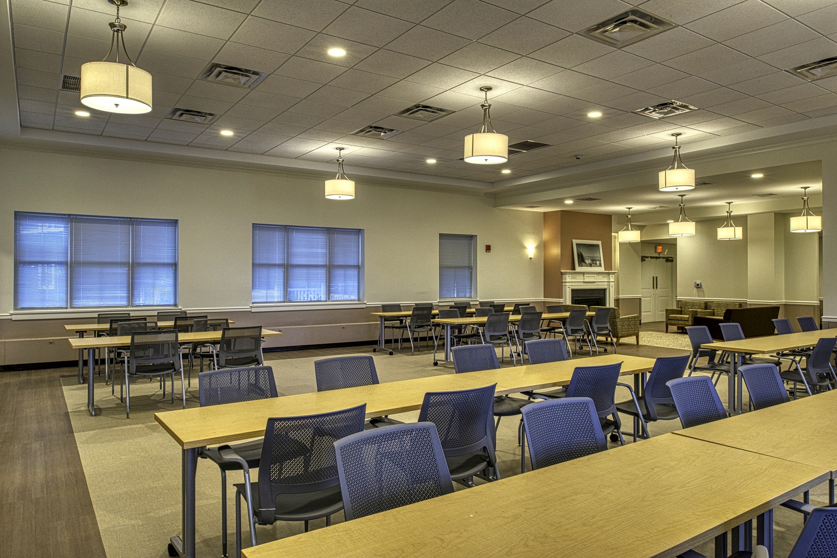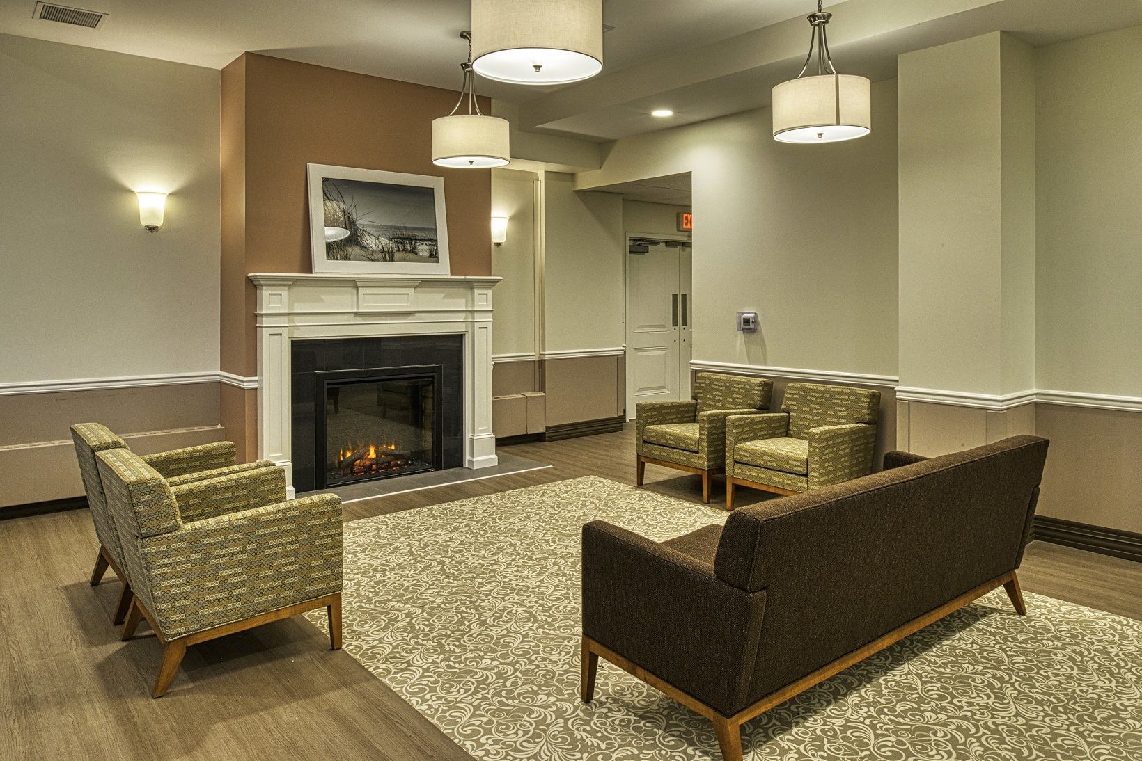 Building interior: Redesign of lobby featuring a seating area and grand faux fireplace